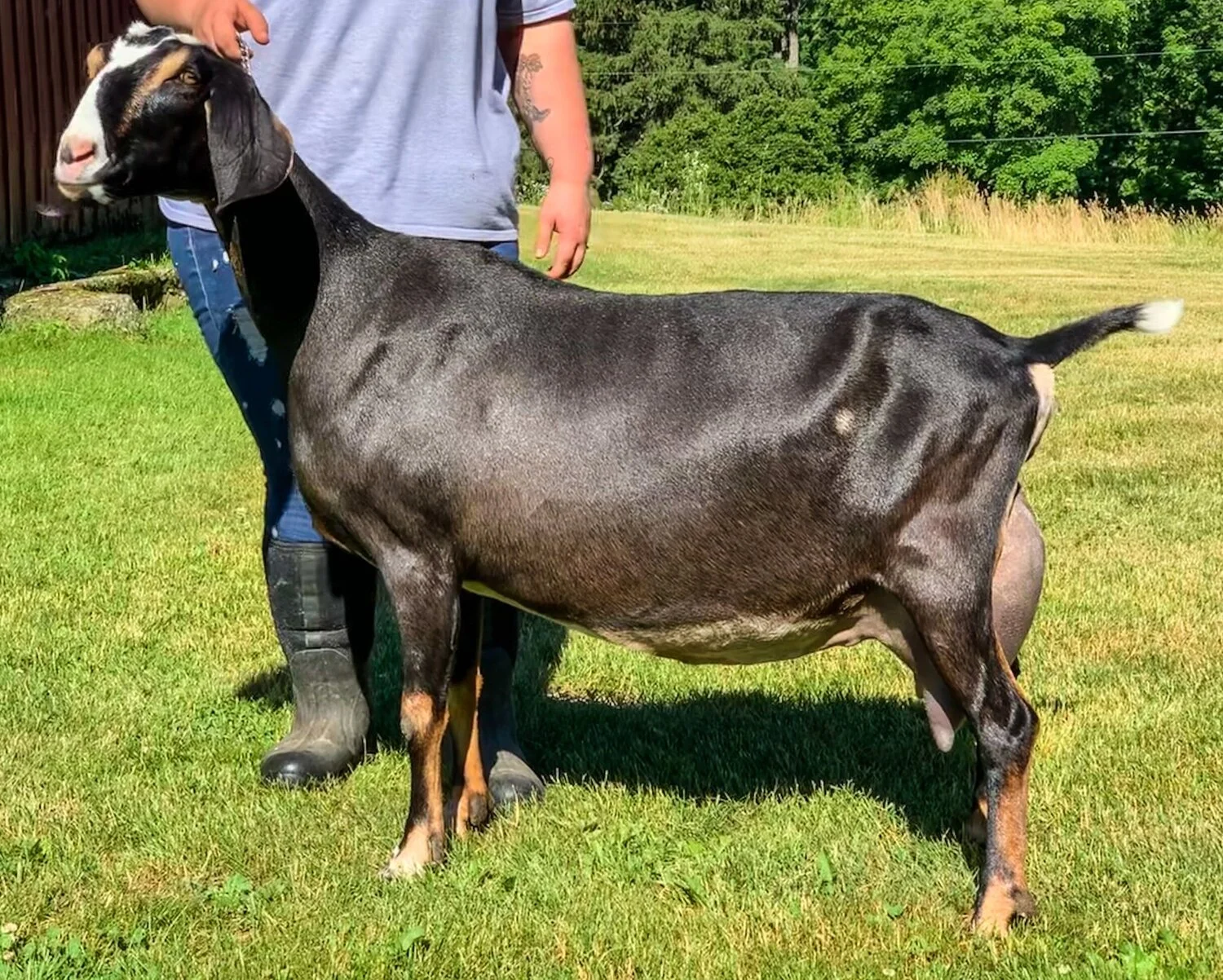 In 2017, we added GCH Paradiso Moonshyne 2*M, starting our foray into the Experimental herdbook, allowing us to own a “Snubian” or two. In 2023, after several years of struggling to increase the “Snubian” herd, we bit the bullet and added our first Saanen doe, Araby-Farm Magnolia Blossom, into our herd.